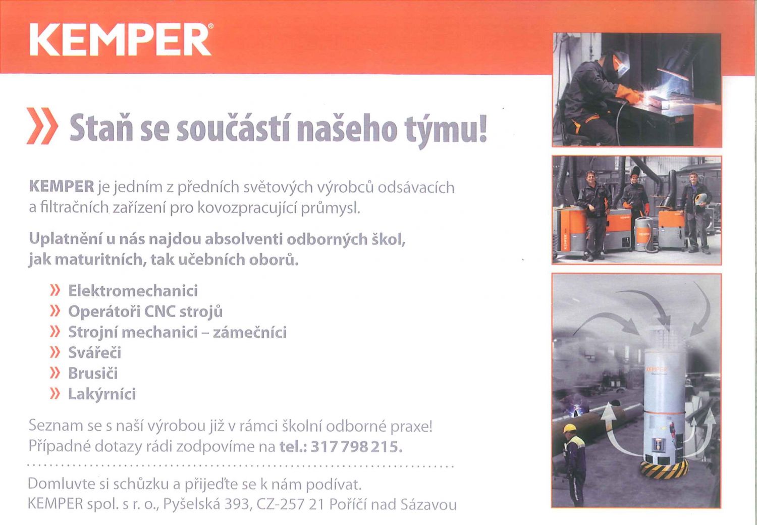 KEMPER Poříčí nad Sázavou Staň se součástí našeho týmu! KEMPER spol. s. r. o., Pyšelská 393, CZ - 25721 Poříčí nad Sázavou Uplatnění u nás najdou absolventi odborných škol, jak maturitních, tak učebních oborů. KEMPER je jedním z předních světových výrobců odsávacích a filtračních zařízení pro kovozpracující průmysl. https://www.kemper.eu/cs Uplatnění u nás najdou absolventi odborných škol, jak maturitních, tak učebních oborů. OPERÁTOŘI CNC STROJŮ STROJNÍ MECHANICI - ZÁMEČNÍCI BRUSIČI SVÁŘEČI ELEKTROMECHANICI LAKÝRNÍCI Bseznam se s naší výrobou již v rámci školní odborné praxe! Případné dotazy rádi zodpovíme na tel: 317 798 215 12.03.2019